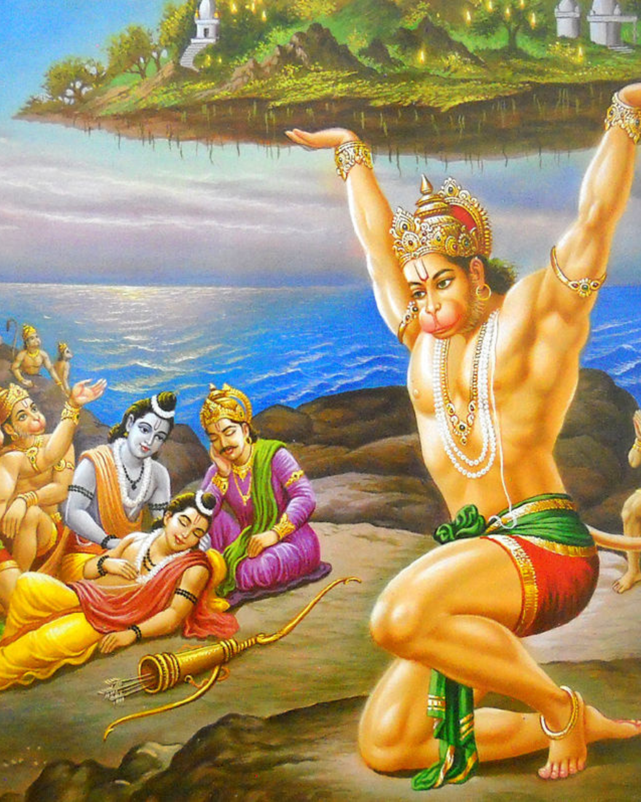 Ram sends his most trusted confidante Hanuman (whom symbolizes strength and energy with unyielding devotion to Rama and his selfless dedication to God) in search of Sanjevani, but is unable to find and recognize the healing herb. Aided by his dynamic yogic powers, Hanuman returns, bringing the entire mountain with him along with the Vaidyas (doctors of Ayurvedic Medicine) and the herbs. The Vaidyas then deliver Sanjevani to Lakshman and he is rejuvenated, thus saving his life. Lakshman returns to battle and aids in winning the war against the evil King Ravan. Therefore, good triumphs over evil. This story immortalizes Sanjevani as the “Herb of Life.”